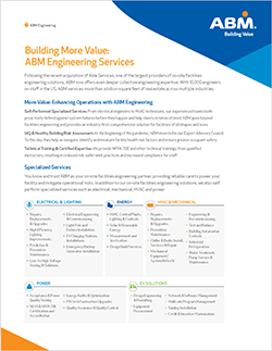 10,000+ engineers strong, ABM is one of the largest providers of on-site engineering solutions in the U.S. ABM Engineering+ is purpose-built to be more comprehensive, customized and proactive with on-site engineers—and expedited access to experts in specialized technical solutions. Our new guide outlines our approach and details how ABM on-site engineers and specialized technical services experts work together to deliver more comprehensive, customized and proactive solutions. See how ABM Engineering+ can help your operational efficiency, responsiveness and occupant satisfaction goals.